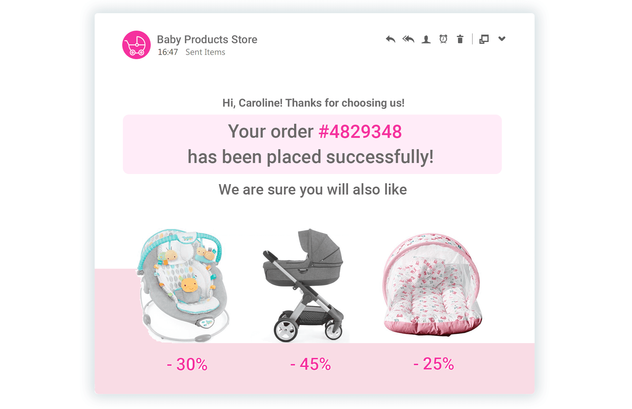 Help your customers find other products they need — or even those they never knew they needed! By intelligently predicting what your customers may want to buy next and presenting the products in your confirmation emails, you can easily drive more sales.