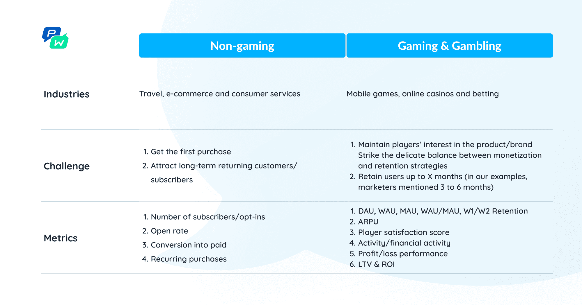 No matter the industry, all marketers want to remind users about their apps. Among various channels for retention, non-gaming marketers mentioned emails, push notifications, and WhatsApp. At the same time, gaming marketers mentioned push notifications, SMS, in-apps, social media, communities, along with emails and phone calls.