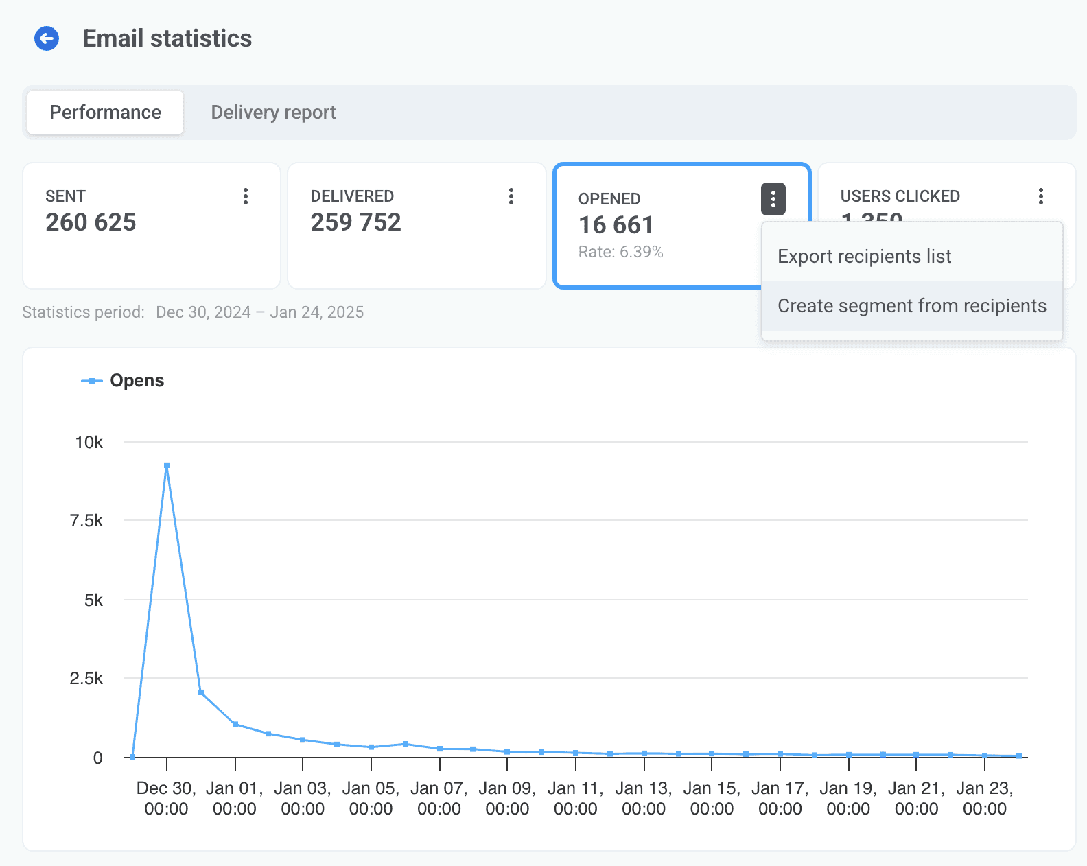We want to analyze recipients who opened and clicked our newsletter in detail. This time, we click the Opened tab > Export recipients list to sync this data with our data analytics tool.
