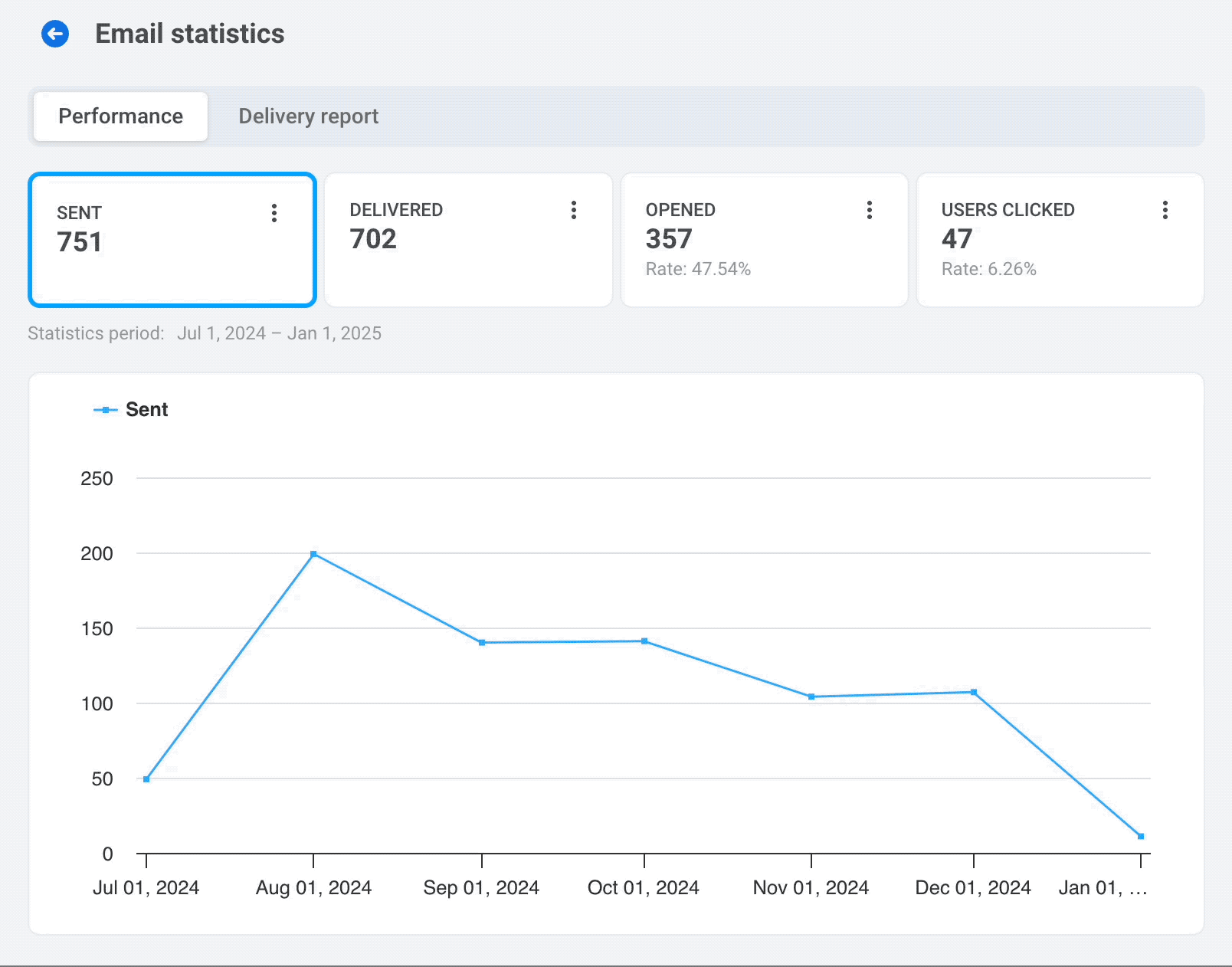 - Sent, delivered, opened, and users clicked with the ability to export user emails and user IDs.