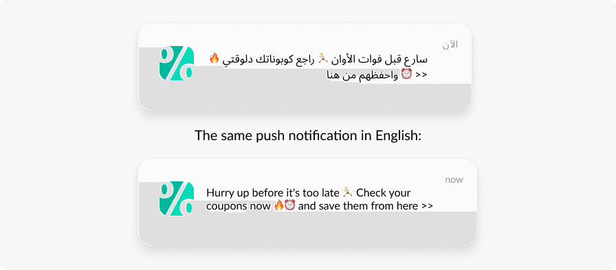 - Personalization: differentiating messages by language: if a user speaks Arabic, a message will be sent in Arabic; otherwise the message will be sent in English;