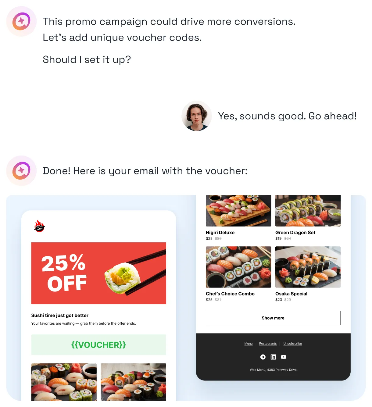 Share your concept in chat and AI translates it into a complete omnichannel messaging blueprint: what to send, to which audiences, and at what moment.