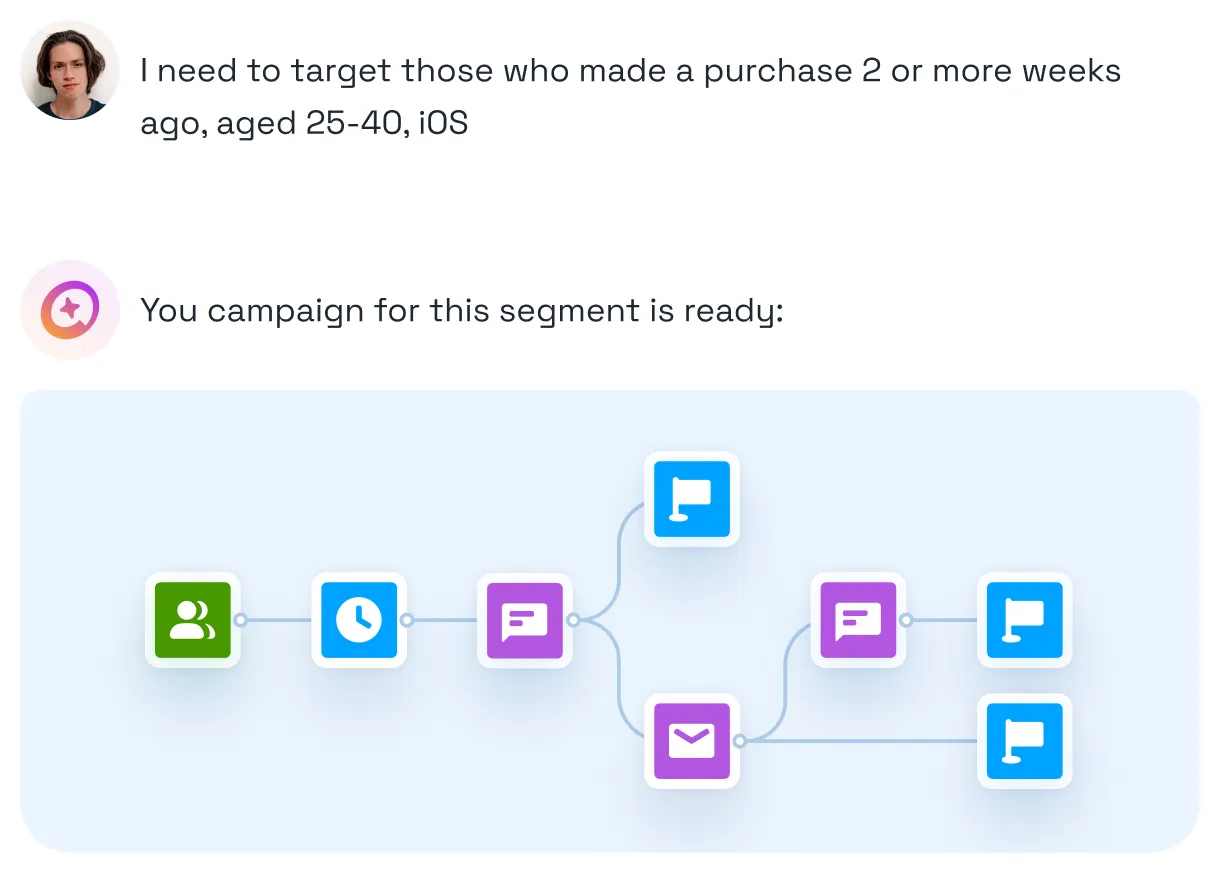 No configuration needed on your side. AI builds messaging workflows, applies segmentation, and runs A/B/n tests.